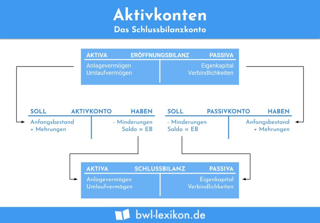 Am Ende eines Geschäftsjahres müssen die Salden aller Bestandskonten ermittelt werden. Dieser Vorgang wird als Saldieren bezeichnet. Der Schlusssaldo eines Kontos ist die Differenz zwischen der Summe der Soll- und der Summe der Habenbuchungen. Bei Aktivkonten steht der Endbestand auf der Habenseite, da die Zugänge (Soll) typischerweise höher sind als die Abgänge (Haben). Bei Passivkonten steht der Endbestand auf der Sollseite, da die Zugänge (Haben) typischerweise höher sind als die Abgänge (Soll). Diese Endbestände bilden die Schlussbilanz, die wiederum die Grundlage für die Eröffnungsbilanz des nächsten Jahres darstellt.