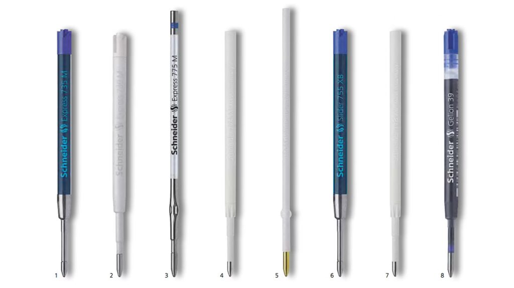 • Schneider® 774 (Pasten-Mine): Eine Kunststoff-Mine mit Edelstahl-Spitze im ISO-Format H. Strichstärke Medium, erhältlich in Schwarz, Blau, Grün und Rot.