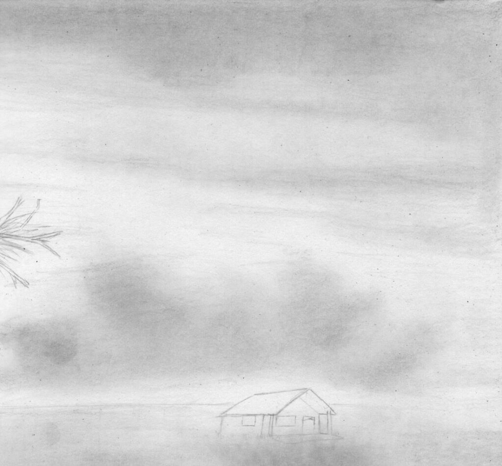 Interessanterweise malt man beim Wolken malen oft nicht die Wolke selbst, sondern das Blau des Himmels dazwischen. Die Wolke entsteht oft durch die Bereiche, die man weiß lässt – also das unbemalte Papier. Schatten innerhalb der Wolke werden gesetzt, aber die Hauptarbeit liegt darin, den Himmel so zu malen, dass die Wolkenformen hervortreten.